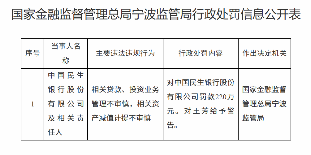 12月31日,国家金融监督管理总局宁波监管局行政处罚信息公开表显示,中国民生银行股份有限公司及相关责任人因相关贷款、投资业务管理不审慎,相关资产减值计提不审慎被罚款220万元。王某被警告。